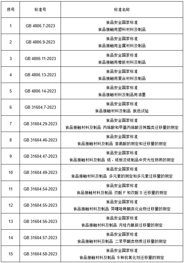 2023年9月25日,國家衛(wèi)生健康委員會發(fā)布了85項食品安全國家標準和3項修改單(衛(wèi)健委2023年第6號公告),其中17項標準涉及食品接觸材料,包括5項產品標準(塑料、金屬、橡膠、復合材料、油墨)和12項方法標準(遷移通則、方法驗證通則、特定遷移量檢驗方法等)。