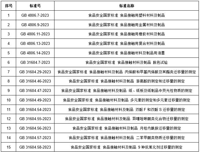 2023年9月25日,國家衛(wèi)生健康委員會發(fā)布了85項(xiàng)食品安全國家標(biāo)準(zhǔn)和3項(xiàng)修改單(衛(wèi)健委2023年第6號公告),其中17項(xiàng)標(biāo)準(zhǔn)涉及食品接觸材料,包括5項(xiàng)產(chǎn)品標(biāo)準(zhǔn)(塑料、金屬、橡膠、復(fù)合材料、油墨)和12項(xiàng)方法標(biāo)準(zhǔn)(遷移試驗(yàn)通則、方法驗(yàn)證通則、特定遷移量檢驗(yàn)方法等)。